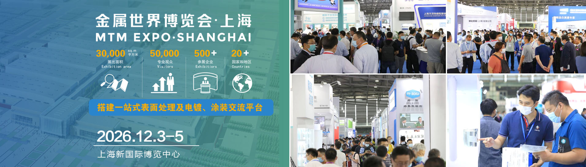 2026中国国际表面处理及电镀、涂装展览会将于2026年12月3-5日在上海新国际博览中心隆重召开,隶属于上海金属世界博览会下属展示区,是中国地区的专业展会,本届展会以"科技创新、品牌重塑、增值优化、解决方案"为主题,集中展示现阶表面处理电镀涂装行业各领域的先进产品、技术、材料、设备等,推动行业面向上下游服务创新,为表面处理、电镀、涂装行业搭建展示与交流平台,倾情为展商及观众呈现一个高品质的行业盛会。2026预计将吸引来自国内外超过500家企业参展,期待您的参与!